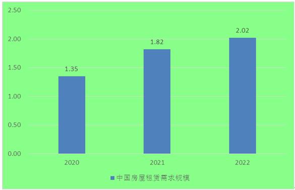 图表:2020-2022年中国房屋租赁行业市场需求(单位:万亿元)