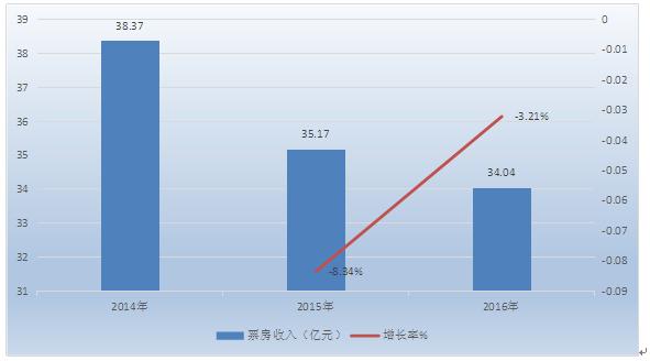 中国旅游演艺票房收入为38.37亿元,2015年票房收入为35.17亿元,同比下降了8.34%,2016年票房收入为34.04亿元,同比下降了3.21%。