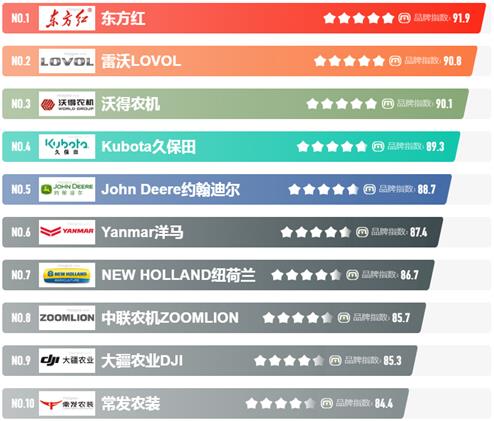2023年农机十大品牌榜中榜的数据显示,我国消费者青睐的农业机械品牌主要有:东方红、雷沃、沃得农机、久保田、约翰迪尔、洋马、纽荷兰、中联农机、常发农机等。