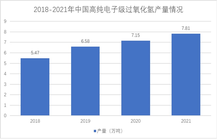 2018年中国高纯电子级双氧水产量为5.47万吨,2021年为7.81万吨,年复合增长率达13%。虽然受疫情的影响,2020年和2021年的产量增长有所下滑,但整体而言,增速仍保持着较高的态势。