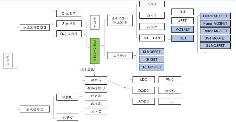 功率半导体包括功率半导体分立器件(含模块)以及功率IC等。其中,功率半导体分立器件,按照器件结构划分,可分为二极管、晶闸管和晶体管等。