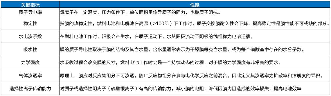 基于电解水、燃料电池和液流电池中所起到的关键作用,质子交换膜需具备:高的质子导电率、较好的化学及物理稳定性、适度的吸水性、较好的力学强度、较低的尺寸变化率、较低的气体渗透率、高选择性离子传输能力,同时还应具备较高的机械强度、可加工性好以及适当的性价比。
