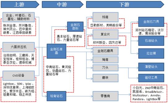 人造金刚石产业链包括:(1)上游原材料供应商及设备:包括合金、石墨、叶腊石等原材料供应商及压机设备供应商,已形成国产替代;(2)中游金刚石及培育钻石生产制造企业:以中南钻石有限公司(简称中南钻石)、河南黄河旋风股份有限公司(简称黄河旋风)、郑州华晶金刚石股份有限公司(简称华晶金刚石/豫金刚石)、河南省力量钻石股份有限公司(简称力量钻石)为首,2020年CR4企业金刚石单晶销售额占国内市场份额70%以上,培育钻石市场占有率约80%;(3)下游:主要是金刚石工具生产企业,包括金刚石刀具、钻头、磨具、锯片、线锯等金刚石工具生产企业;进一步拓展到终端消费行业,包括建材、矿产资源机械制造、清洁能源等行业。