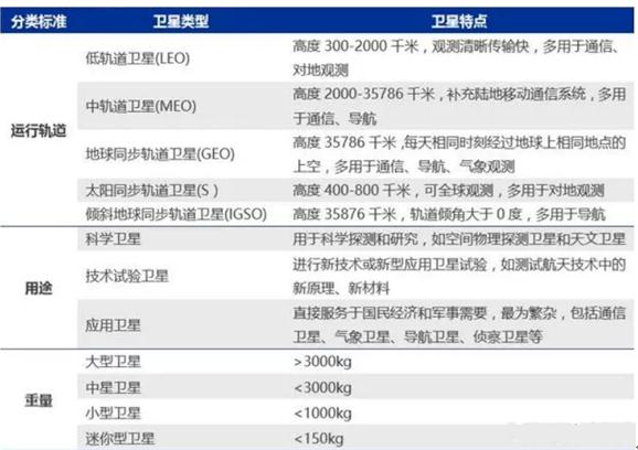 按照卫星重量大小,可分为大卫星(1000kg以上)、中卫星(500-1000kg)和小卫星(500kg以下)。然而,随着小卫星技术和应用的不断发展,业界对小卫星分类又进行了细化。例如,国际电联提出了对小卫星重量、功率、成本等主要参数的类型划分标准,见下表。