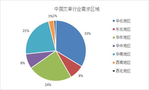 据数据显示,中国艾草行业需求区域华北地区占比为33%,华东地区占比为24%,华南地区占比为23%。