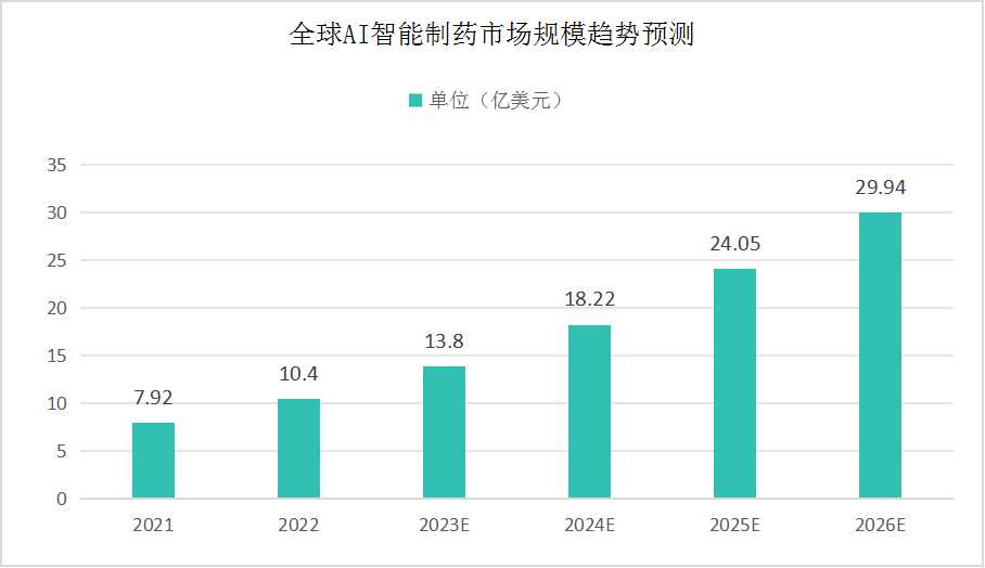 据中研产业研究院《2023-2028年中国智能制药行业竞争分析及发展前景预测报告》分析,未来几年,随着技术的不断突破和市场的进一步成熟,AI制药市场的渗透率有望进一步提高。此外,随着全球人口老龄化和疾病负担的增加,对创新药物的需求也将持续增长,这为AI制药市场的发展提供了巨大的机遇。据Research And Markets的数据显示,全球AI智能制药市场规模在2022年达到了10.4亿美元。这个市场预计将迎来快速的增长,预计到2026年,全球AI制药市场规模将达到惊人的29.94亿美元,如上图所示。