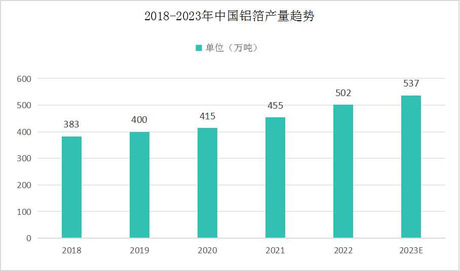 据中国有色金属加工工业协会的最新数据显示,中国铝箔产量在近年来呈现出稳步增长的态势。从2018年的383万吨增长至2022年的502万吨,年均复合增长率达到了7.00%。这一增长主要得益于国内包装和锂电池行业的快速发展。随着人们对环保和可持续发展的日益重视,铝箔作为一种环保、高性能的包装材料,其市场需求持续增长。同时,电动汽车和可穿戴设备的普及也进一步推动了锂电池行业的发展,进而为铝箔产业提供了更广阔的市场空间。