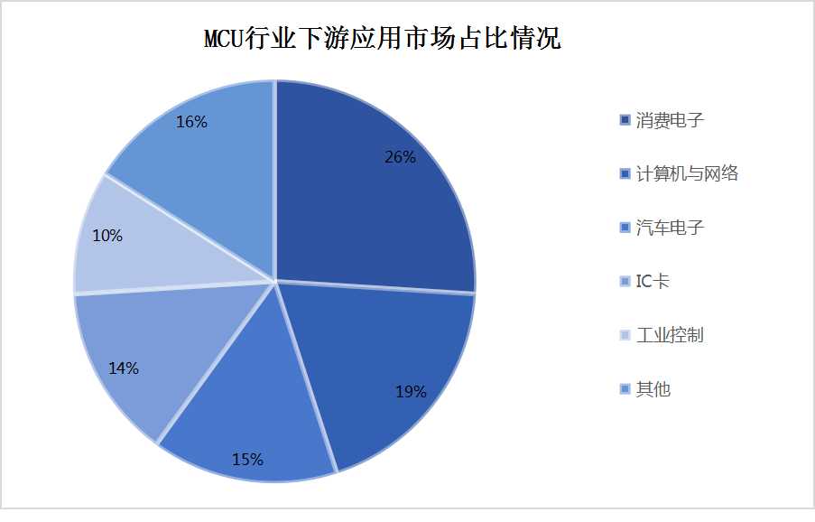MCU作为工控领域的核心部件,其下游应用领域广泛,包括消费电子、计算机与网络、汽车电子、IC卡和工业控制等。从市场占比来看,消费电子是MCU市场的主要应用领域,占据了26%的市场份额。