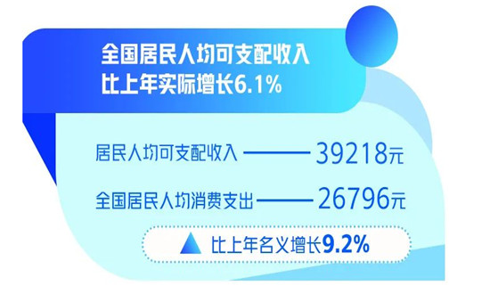 2023年,全国居民人均可支配收入39218元,比上年名义增长6.3%;扣除价格因素,实际增长6.1%,名义和实际增速分别比上年快1.3个和3.2个百分点。