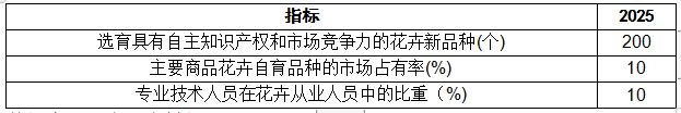 到2025年,花卉科技创新能力大幅提升,我国花卉种质资源得到有效保护和合理利用,种业创新体系基本建立,自主创新能力和科技支撑能力明显提升,主要商品花卉品种和种子(种苗、种球)国产化水平不断提高。花卉生产布局更加科学合理,花卉多种功能有效拓展,一二三产业协调发展,产品供给能力显著增强,质量效益稳步提升。