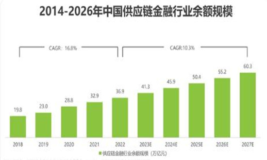 2022年中国供应链金融行业规模36.9万亿元,预计未来五年将以10.3%的CAGR增长,2027年将超60万亿元