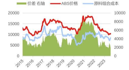 2023年1-11月,ABS产量为549.84万吨,较2022年同期增加了117万吨,同比增加27.02%。从新装置投产来看,2023年投产200万吨/年产能,总产能达到751.5万吨/年,较2022年增加36.26%,产能快速扩张。从生产利润来看,ABS生产进入亏损状态,并且持续加深,尤其是下半年随着新投产能持续释放而下游需求不足,亏损加深至1000元/吨,创历年新低。从开工率来看,ABS开工率在80%附近震荡,较2022年进一步下移,快速增加的产能对行业造成了明显的压力。