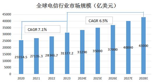 根据Research And Markets相关数据显示,全球电信产业市场规模由2020年的25554.5亿美元增长至2023年的31377.2亿美元,年复合增速达到7.1%。另外,根据Research And Markets预测数据显示,全球通信产业市场规模至2028年底有望达到43000亿美元,2023-2028期间年复合增长率有望达6.5%。可以看出,近些年来全球随着科技进步加速发展,全球通信产业市场空间得到巨大提升。