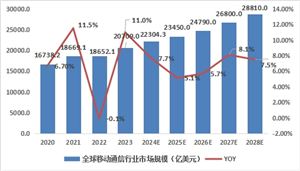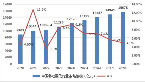 根据工信部相关数据显示,2020-2023年期间,电信行业市场规模总体呈现出了持续增长态势,截至2023年底,我国电信业务收入累计完成1.71万亿元,比上年增长7.6%,四年间年复合增长率达8%。另外,随着我国电信业务持续健康发展,预计我国电信行业市场规模在2023-2028年期间,有望以6.5%的年复合增长率增长,预计至2028年底,我国电信行业市场规模有望增长至为2.34万亿元。根据工信部发布的相关数据显示,2020-2023年期间,中国移动通信业务收入在电信业务收入占比长期维持在65%以上水平。根据该数据可以进一步推算出2020-2023年期间,中国移动通信行业市场规模情况,根据相关数据显示,截至2023年底,中国移动通信行业市场规模达11286亿元,同比2022年期间增长了8.6%。另外,伴随物联网与互联网的高速发展,移动通信行业下游应用场景增多,移动通信服务范围进一步扩大,预计中国移动通信行业市场规模至2028年底有望增长至为15678亿元。