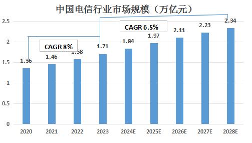 根据工信部相关数据显示,2020-2023年期间,电信行业市场规模总体呈现出了持续增长态势,截至2023年底,我国电信业务收入累计完成1.71万亿元,比上年增长7.6%,四年间年复合增长率达8%。另外,随着我国电信业务持续健康发展,预计我国电信行业市场规模在2023-2028年期