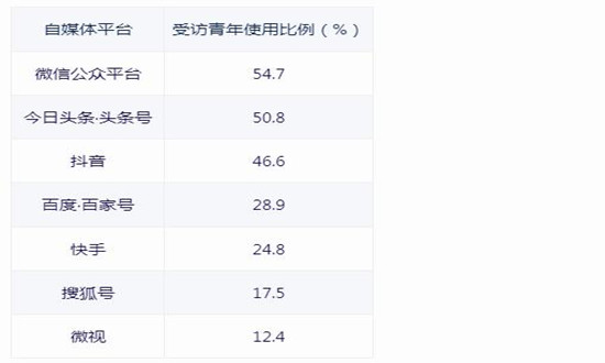 调查显示,受访青年使用较多的自媒体平台包括微信公众平台(54.7%)、今日头条·头条号(50.8%)和抖音(46.6%)。其他还有:百度·百家号(28.9%)、快手(24.8%)、搜狐号(17.5%)、微视(12.4%)等。