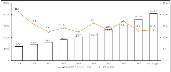 软件业务收入高速增长。2023年,全国软件和信息技术服务业规模以上企业超3.8万家,累计完成软件业务收入123258亿元,同比增长13.4%,增速较上年同期提高2.2个百分点。数据来源(国家统计局)