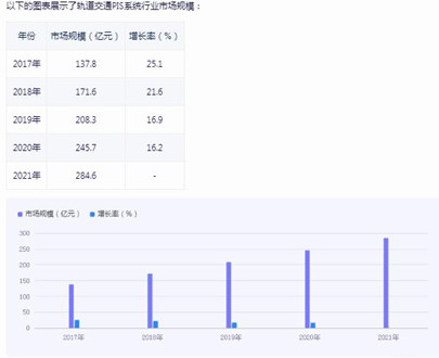 近年来,我国轨道交通PIS系统行业市场规模持续扩大,市场规模从2017年的约137.8亿元增长到2021年的约284.6亿元。就增长率来看,2017年至2018年增长约25.1%,2018年至2019年增长约21.6%,2019年至2020年增长约16.9%,2020年至2021年增长约16.2%。这些数据表明我国轨道交通PIS系统行业市场规模持续增长,并且增速较为稳定。这一趋势得益于我国城市化进程的快速推进以及对交通信息化需求的增加。同时,不断追求交通出行效率也促使了PIS系统的广泛应用和发展。整体而言,我国轨道交通PIS系统行业市场呈现出良好的发展势头。