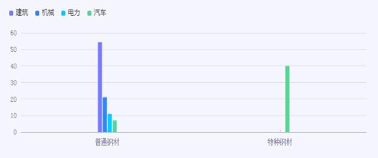 因为用途的不同,钢材也可分为普通钢材和特种钢材,其中普通钢材的下游需求主要集中在建筑、机械、电力及汽车等领域,其中建筑领域占比超过一半,高达54.3%,机械领域为21%,电力领域为10.9%,汽车领域为 7%。而特种钢材因为其物理性和化学性都优于普通钢材,所以特种钢材的下游需求主要集中在汽车、工业制造、金属制品及发电等高端制造业。其中汽车需求占比达到了40%。