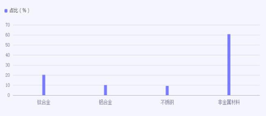 数据显示,在我国整个3D打印市场中,钛合金、铝合金、不锈钢分别占20.2%、10.0%、9.1%,合计占比39.3%,其余60.6%均为非金属材料,包括尼龙、PLA、ABS塑料、树脂等。