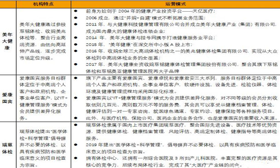 我国民营体检机构经过多年吸收合并,目前呈现寡头格局。其中美年健康+慈铭体检市场份额约26%;爱康国宾位居第二,份额约15%;瑞慈体检以3.3%的市场份额排名第三。随着产业集中度的持续提升,民营体检市场竞争日趋激烈,呈现纵向服务升级横向并购扩张的势态,各大机构围绕市场定位、资源整合、盈利模式、平台战略和价值创造等领域加强商业模式创新。