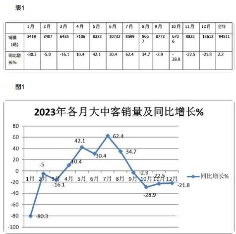 根据中国客车统计信息网数据,2023年全年大中型客车(含6米以上,下同)累计销售94511辆,同比增长2.2%, 1-12月各月大中型客车销量及同比统计如下: