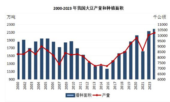 2023年,国家出台稳定大豆生产一揽子支持政策,提高大豆生产者补贴,加大金融信贷支持,推广大豆玉米(2388, -14.00, -0.58%)带状复合种植,引导新型农业经营主体种植大豆,稳定大豆种植规模。受政策支撑,加之本年度年国产大豆播种及生长期天气整体理想,2023年我国大豆播种面积、单产、产量均实现同比增长。根据国家统计局数据,2023年国内大豆产量416.8亿斤,比上年增加11.2亿斤,增长2.8%;大豆单产132.7公斤/亩,每亩产量比上年增加0.7公斤,增长0.5%;大豆播种面积1.57亿亩,比上年增加345.1万亩,增长2.2%,连续两年稳定在1.5亿亩以上。