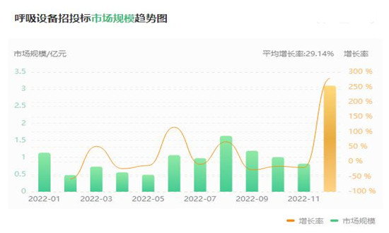医械看市场数据分析工具根据千里马招标网医疗器械行业全量数据统计: 2022年12月份,全国呼吸机公开中标事件累计265次,金额约为3.1亿,共计销售设备1327台,采购单位数量约225家,经销商约236家。