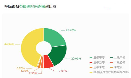 从全国数据看,上半年度采购呼吸机的招标主体仍以三甲和二甲医院为主,采购额占比分别为22.47%和20.06%。三甲医院较上一个月减少16.75个百分点,二甲医院较上一个月增加15.15个百分点,其他级别医院占比情况稍微增加。