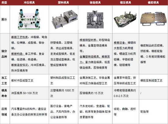 汽车模具是“汽车工艺之母”、“效益放大器”、“创新之基”。模具是指在工业生产中通过注塑、吹塑、挤出、冲压等工艺强迫金属或非金属成型的工具,是制造业的重要基础工艺装备。模具产值与其下游产业产值的比例约1:100,故也被称作工业的效益放大器。模具成型具有高精度、高复杂度、高一致性的技术特点和高加工效率、高材料利用率、低成产成本的制造优势,被广泛应用在工业领域,据统计约75%的粗加工工业产品零件、50%的精加工零件和绝大部分塑料制品均由模具加工成型,因此模具工艺水平被视为衡量一国制造业水平的重要标志。更长远来看,模具是下游工业通过使用新材料、新工艺实现轻量化、节能降耗、结构创新、产品创新的重要载体,模具本身的创新也为下游产业链系统化创新提供了支撑。
