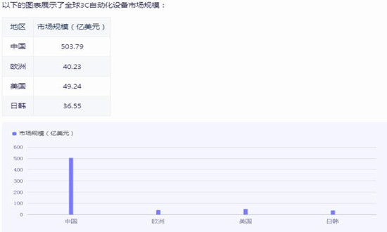 随着机器人在汽车行业的应用趋于饱和,3C制造业无疑成了最受关注的行业之一。因此,面对日益火爆的中国市场,国外主要机器人品牌川崎重工、库卡和安川等纷纷加快了中国市场的步伐。据统计,截至2022年全球3C自动化设备市场规模约为503.79亿美元,其中欧洲市场规模约为40.23亿美元,美国市场规模约为49.24亿美元,日韩市场规模约为36.55亿美元。
