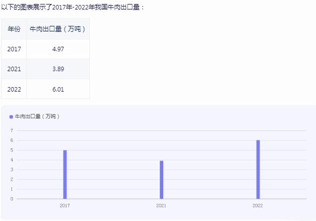 而2021年我国牛肉出口只有3.89万吨,且呈现下降态势,与2017年(4.97万吨)相比,减少了1.08万吨,降幅约21.73%。牛肉行业概况及现状数据显示,2022年我国肉牛累计出口量为6.01万吨,约是2021年全年的25.96%。