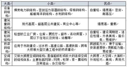 作为最主要的建筑结构形式之一,钢结构广泛应用于房屋建筑、机械、能源、市政设施等行业。钢结构的分类方法尚无统一标准,按应用领域可分为设备钢结构(密封压力容器钢结构,塔桅钢结构、船舶海洋钢结构、水利钢结构、煤炭电力钢结构、钎具和钎钢、地下钢结构等)、建筑重钢结构(高层钢结构、重型厂房等)、建筑轻钢结构(轻型厂房、钢结构住宅等)、桥梁钢结构、空间钢结构等五大类。
