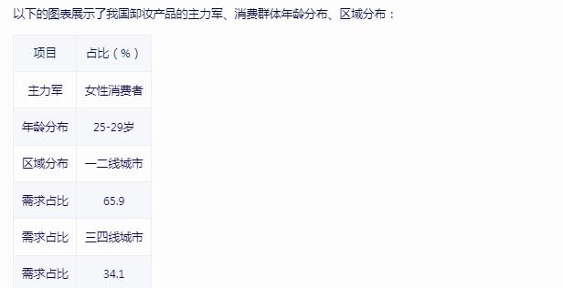 随着线上直播电商行业不断发展,国内卸妆产品线上市场规模不断扩大,进而带动国产卸妆产品品牌数量不断增加、产品不断更新迭代,行业竞争较为激烈。目前女性消费者仍是我国卸妆产品的主力军;从消费群体的年龄分布来看,25-29岁年龄阶段消费群体对卸妆产品的需求量较大;从区域分布来看,一二线城市居民对卸妆产品需求较大,需求占比为65.9%,三四线城市需求占比为34.1%。随着我国卸妆产品销售渠道不断增加,未来三四线城市将是卸妆产品的下沉市场,行业发展空间广阔。