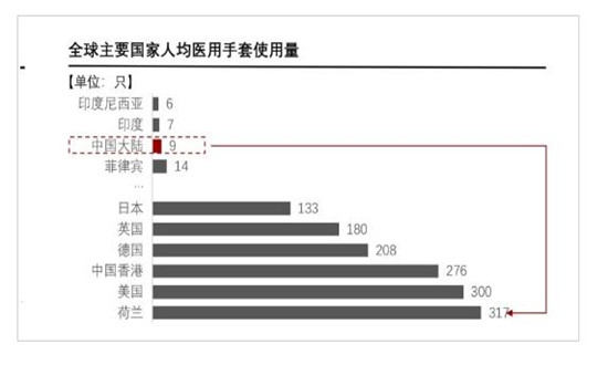 《白皮书》数据显示,中国大陆人均医用手套使用量是拥有最多人均数量的荷兰(317只/人)的1/35;随着使用习惯、消费意识的建立与培养,未来中国医用手套市场增长潜力空间巨大。