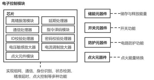 典型的电子控制模块主要由芯片、储能元器件、开关元器件、防护元器件及点火元器件组成。电子控制模块获取起爆控制器提供的电源,可执行身份识别、在线检测、授时延时、起爆控制等多种指令。起爆时,芯片接收到指令并通过身份识别后,按照指令进行高精度延期,延期结束后控制电子开关导通,储能元器件的能量通过开关元器件释放至点火元器件上完成电子雷管起爆。