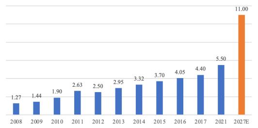 2008至2027年我国精细化工行业工业总产值(万亿元)
