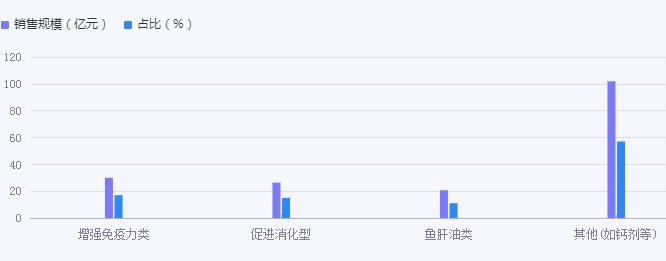 据调查,我国儿童保健食品消费以增强免疫力类为主,销售规模约29.97亿元,占比17%;促进消化型规模26.37亿元,占比15%;鱼肝油类20.68亿元,占比11%;其他(如钙剂等)101.88亿元,占比57%。