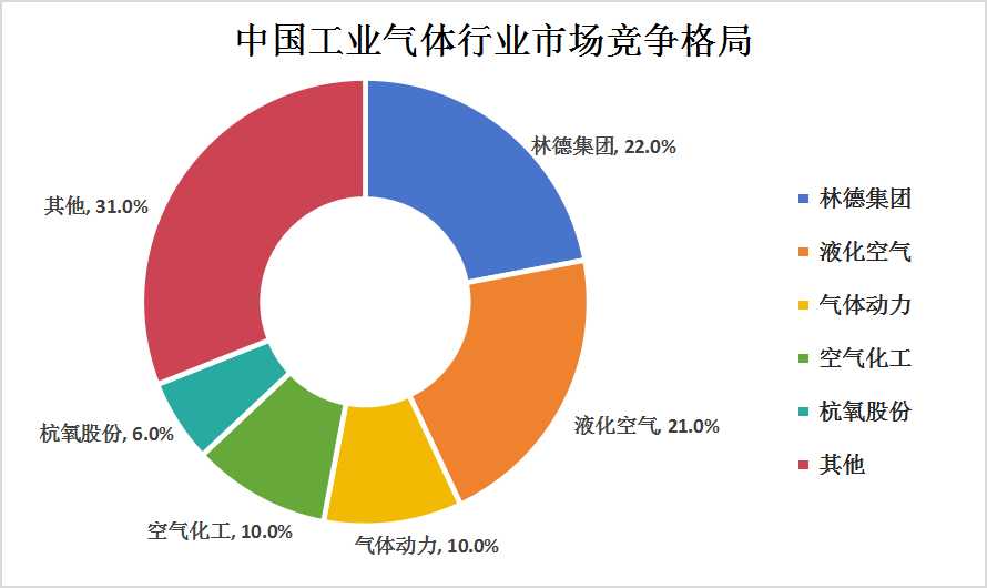 在市场份额方面,林德集团表现突出,占比达到了22%,显示出其在工业气体行业的领先地位。杭氧股份的企业业务涵盖了设备与工程业务、气体业务两部分,其中气体业务占比6%。公司的产品主要包括成套空气分离设备及部机、石化设备和各类气体产品,展现了其多元化的产品线。