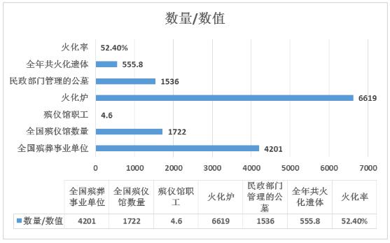 据统计,截止到2020年,全国殡葬事业单位4201个,全国殡仪馆数量1722个,殡仪馆职工4.6万人,火化炉6619台,民政部门管理的公墓1536个,全年共火化遗体555.8万具,火化率达52.4%。