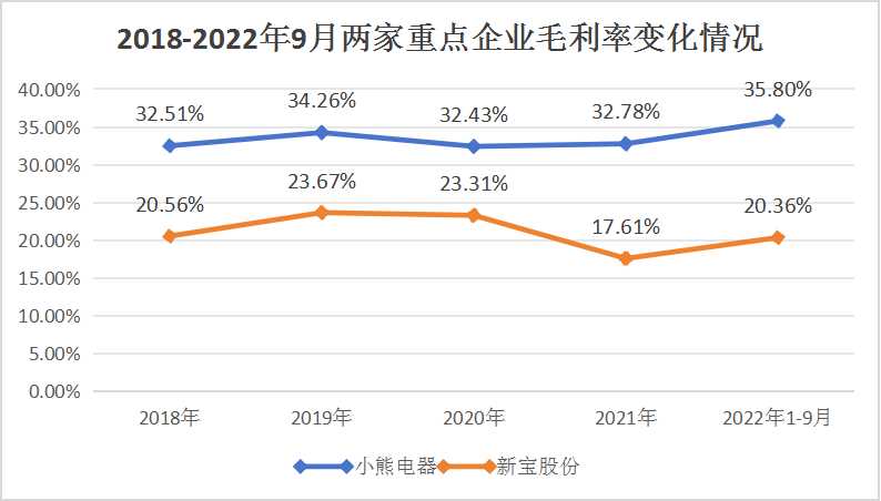截至2022年第三季度,小熊电器和新宝股份的毛利率分别为35.8%和20.36%,进一步印证了两家企业在盈利能力上的差异。小熊电器的高毛利率不仅反映了其产品在市场上的强大竞争力,也体现了其在成本控制、品牌建设等方面的卓越能力。