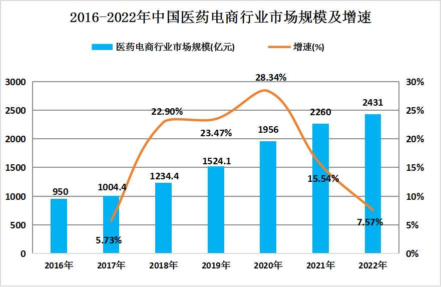 图表:2016-2022年中国医药电商行业市场规模及增速
