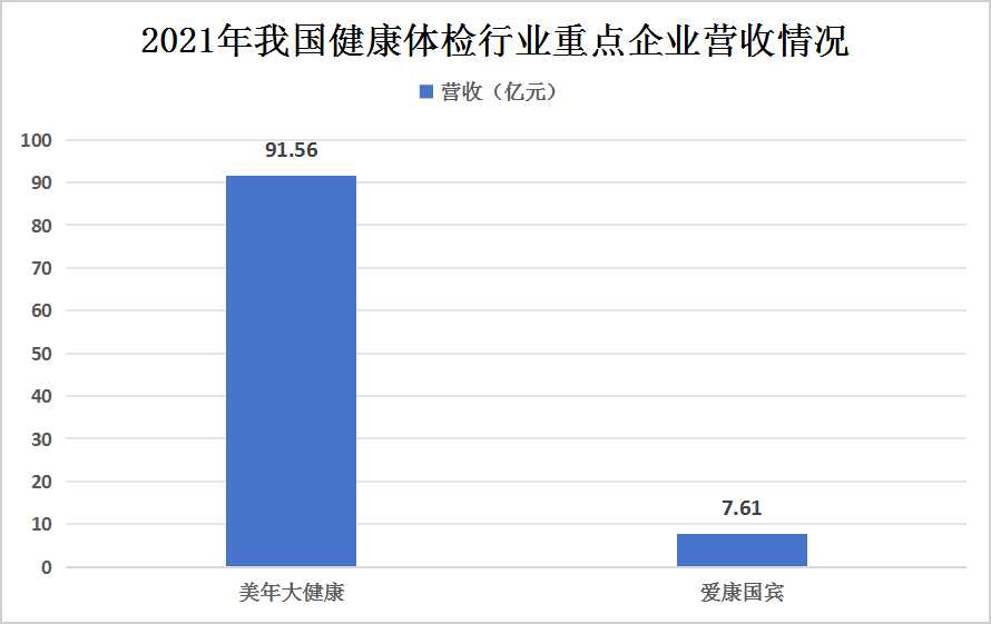 然而,2017年7月,美年大健康成功收购慈铭体检,这一事件标志着民营专业体检机构之间的竞争格局发生了深刻变化,由原本的“三国鼎立”转变为“二元对立”。从营业收入规模来看,美年大健康已经处于行业领先地位,2021年其营收达到了91.56亿元,而爱康国宾的营收为7.61亿元。这一数据对比进一步凸显了美年大健康在民营体检市场中的强势地位。