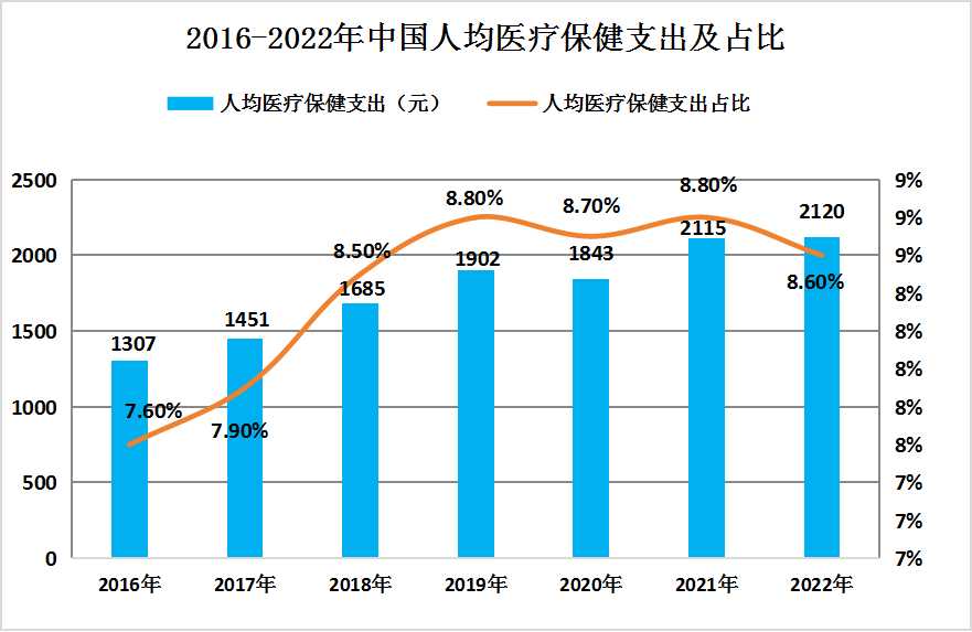 图表:2016-2022年中国人均医疗保健支出及占比
