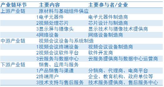 产业链上游为基础设施提供商,包括基础硬件设备厂商、提供网络传输的运营商、MCU设备厂商与IaaS云服务器厂商,上游整体发展成熟,市场竞争较为充分;中游为系统解决方案商,其中传统通信厂商一般整合资源通过直销模式销向ToB/G端客户;平台型厂商和SaaS厂商一般直面客户,提供标准化的会议能力;由于下游客户涉及多行业的不同场景,中游厂商还需要具备为客户提供定制化、场景化视频会议的能力。随着云视频会议的兴起,视频会议应用范围不断下沉,越来越多的视频会议新场景需求得到开发。