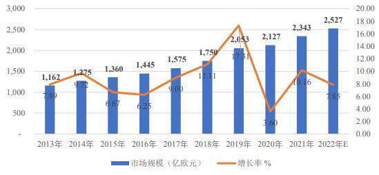 近年来,随着科技发展产品更新换代加快,检测技术水平也不断提高,全球检测行业保持年均复合增长率9%以上的快速增长。初步统计,2022年全球检验检测市场规模将达2,527亿欧元。