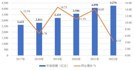 根据国家市场监管总局等发布的数据,2017至2022年我国检验检测市场规模增长了1,643.00亿元,年均复合增长率为10.18%。其中,2022年我国检验检测市场规模达4,276亿元,较2021年增长了186亿元,同比增长4.55%,继续保持较强增长态势。