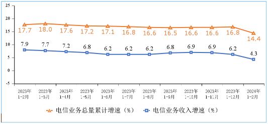 电信业务量收平稳增长。1—2月份,电信业务收入累计完成2923亿元,同比增长4.3%。按照上年不变价计算的电信业务总量同比增长14.4%。