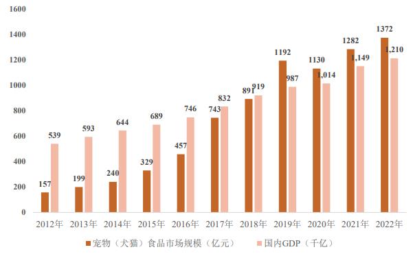 图表:我国宠物(犬猫)食品市场规模与国内GDP增长对比