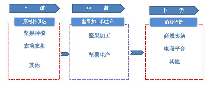 根据中研普华产业研究院发布的《2024-2029年坚果产业现状分析及未来发展趋势报告》显示:从坚果行业产业链来看,坚果行业产业链的上游主要是坚果种植产业以及农药农机等附带产业,中游通过工厂加工,生产出直接食用的坚果炒货;下游则是坚果消费流通渠道,包括个体零售、商超卖场、连锁店铺以及电商平台等,最终流通到终端消费者手上。